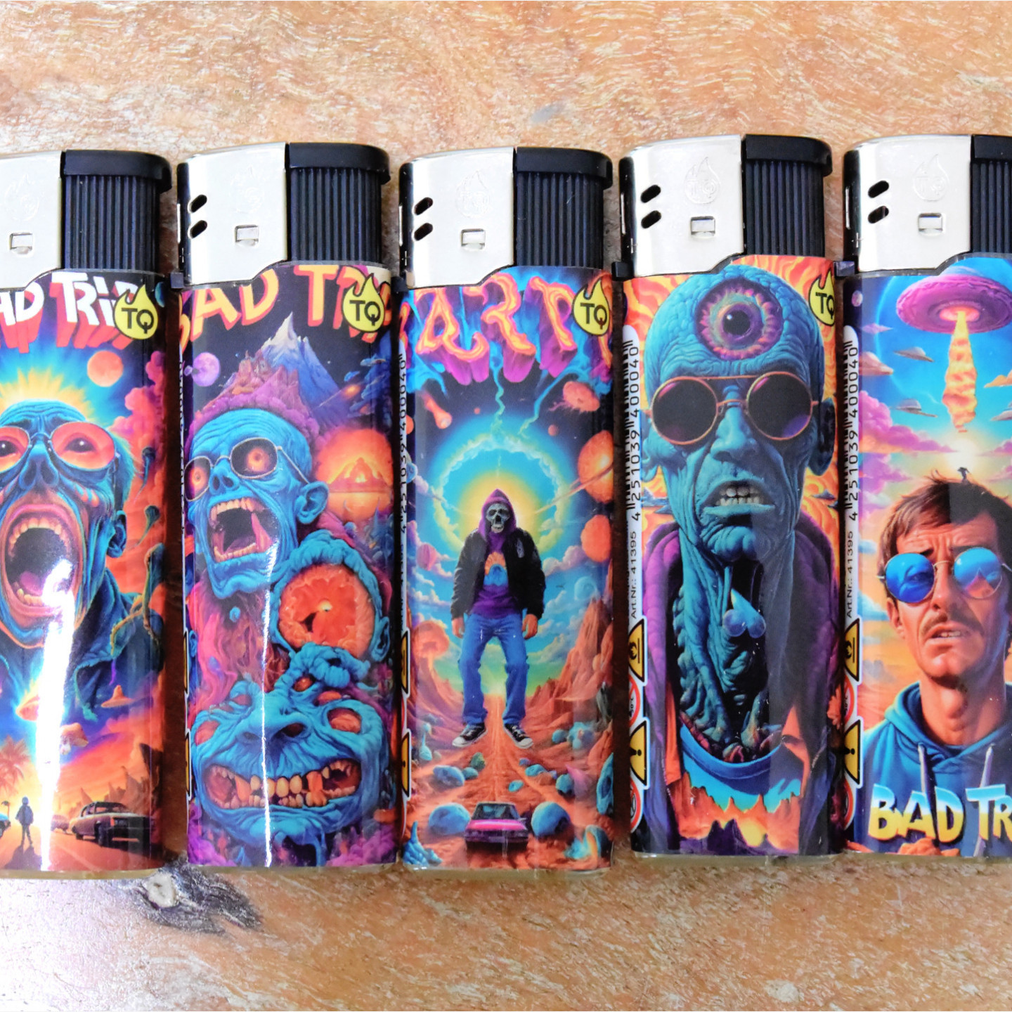 Lot de 5 briquets électroniques "Bad Trip" rechargeable avec allumage piézo : simples, pratiques et décorés de motifs originaux.