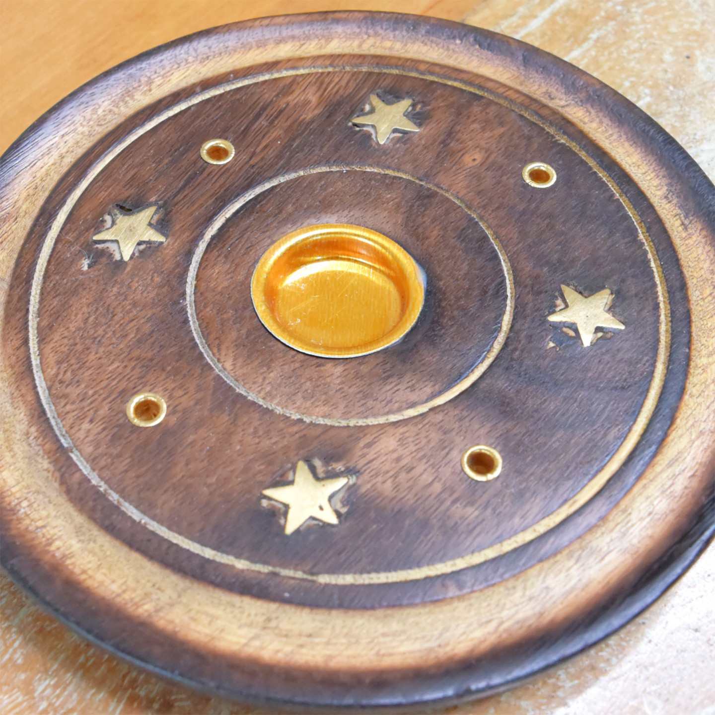Porte encens décoratif fabriqué à partir de bois de manguier avec incrustations en laiton.