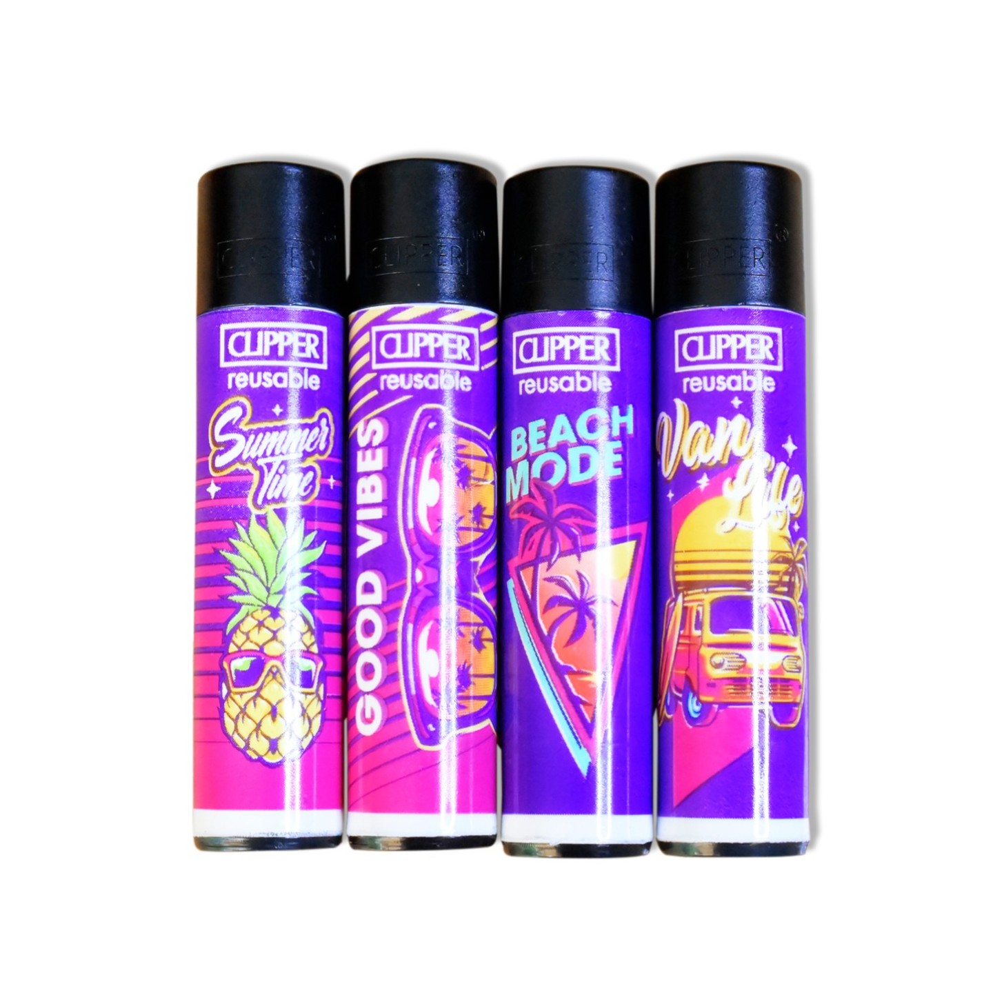 Collection de 4 briquets Clipper « Summer » aux motifs psychédéliques, rechargeables et durables – idéal pour usage quotidien et design original.