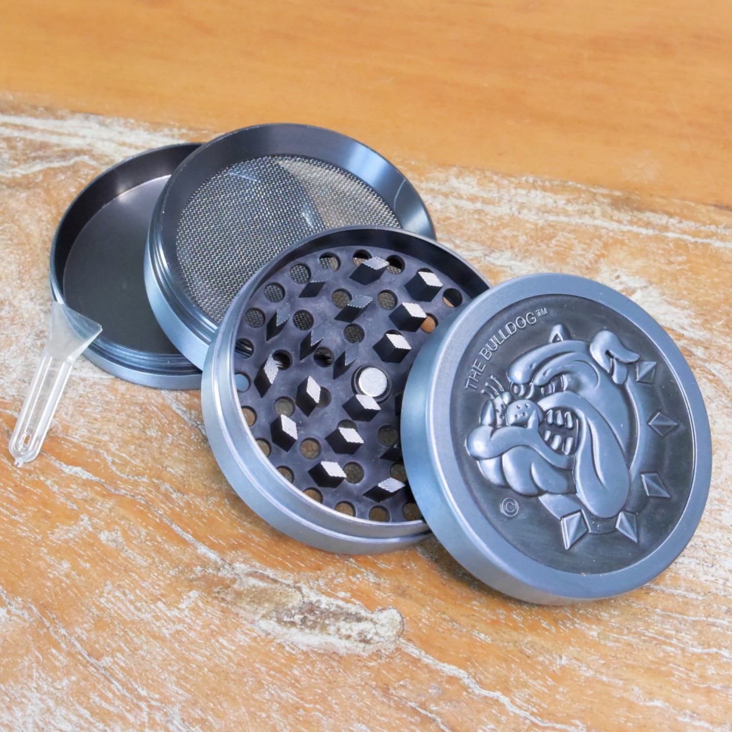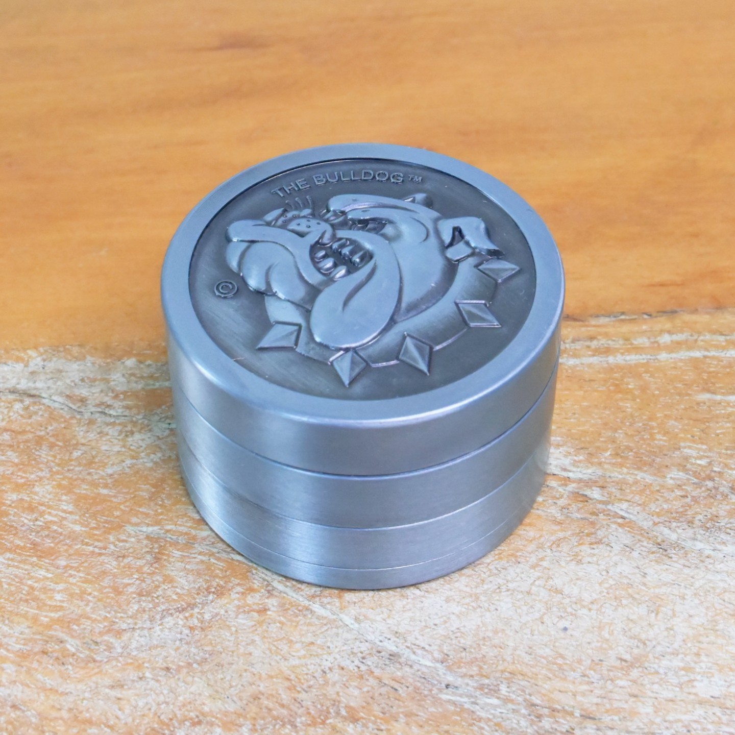 Grinder The Bulldog de la célèbre marque Hollandaise. Composé de 4 parties avec un tamis à pollen pour récupérer les particules les plus fines.
