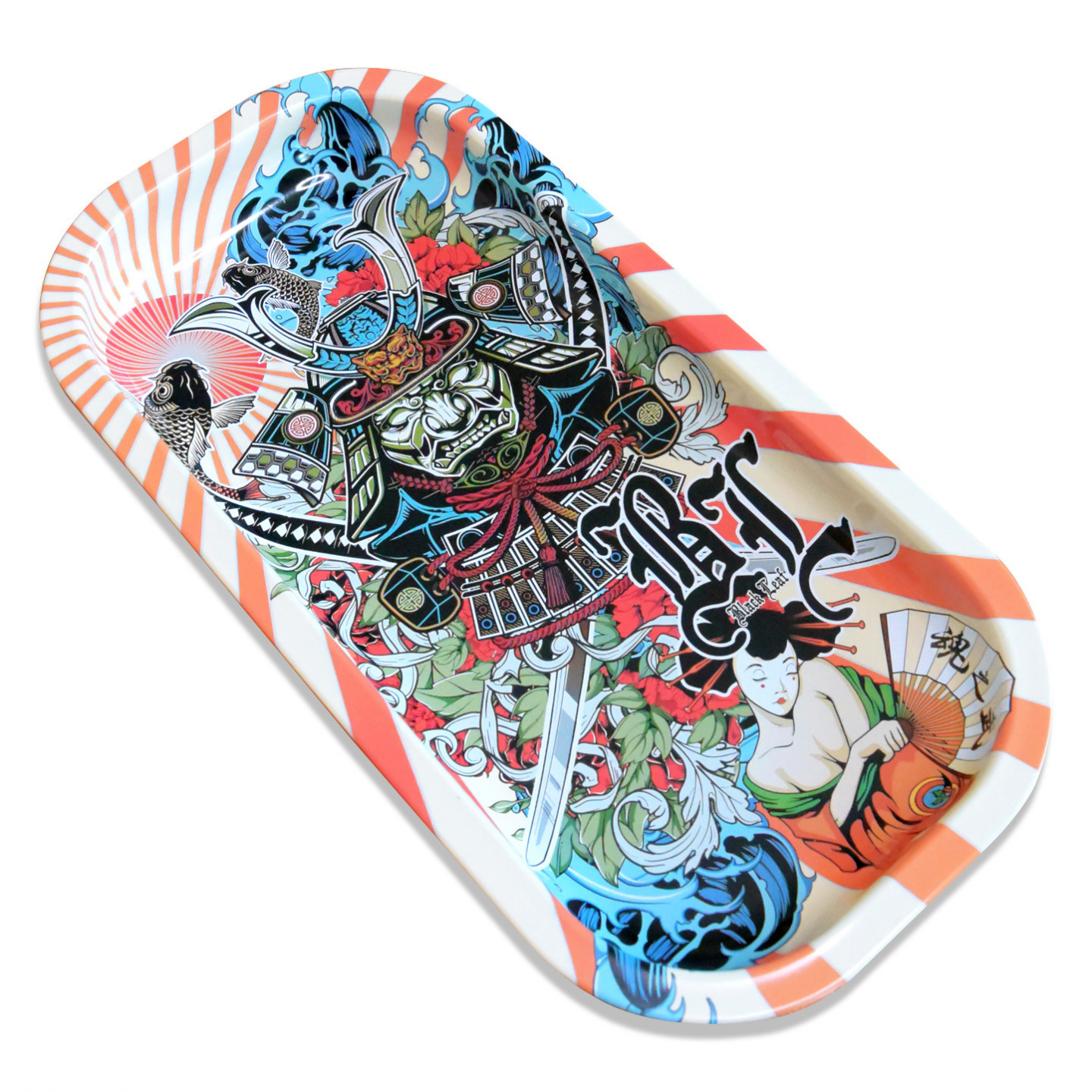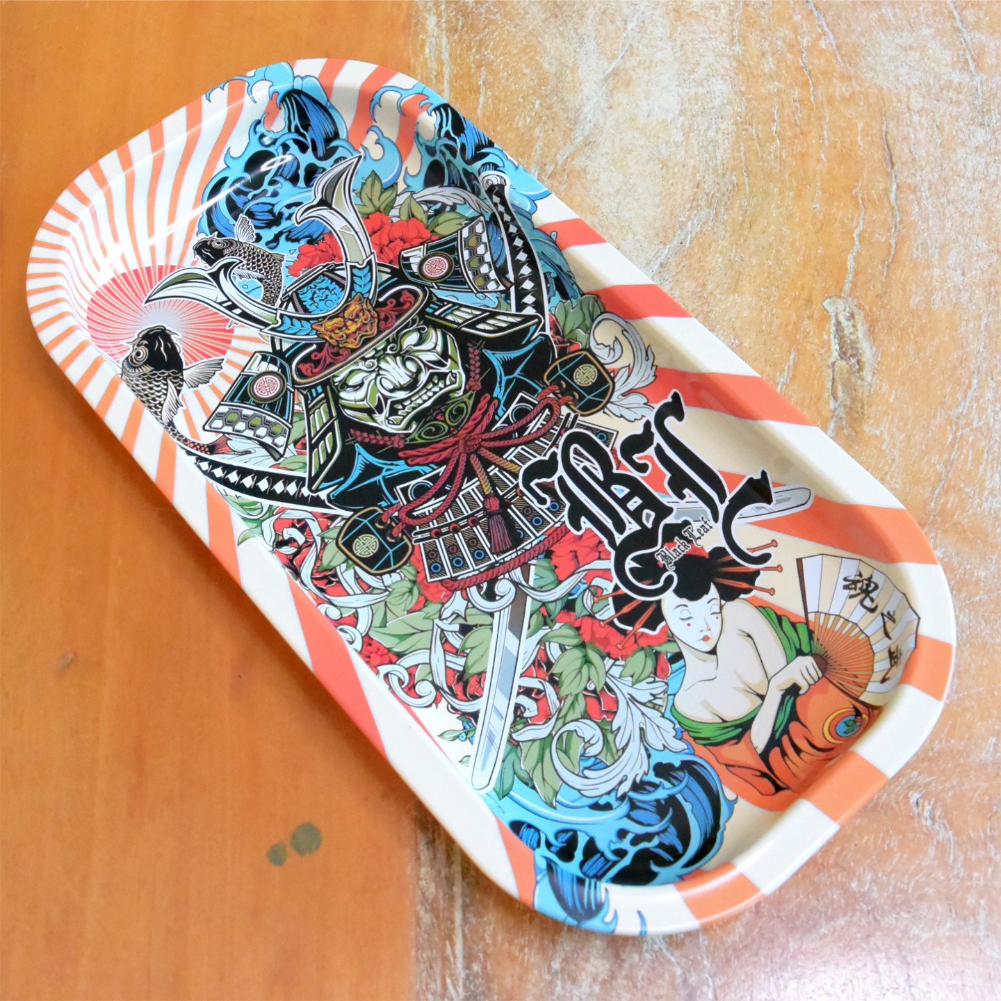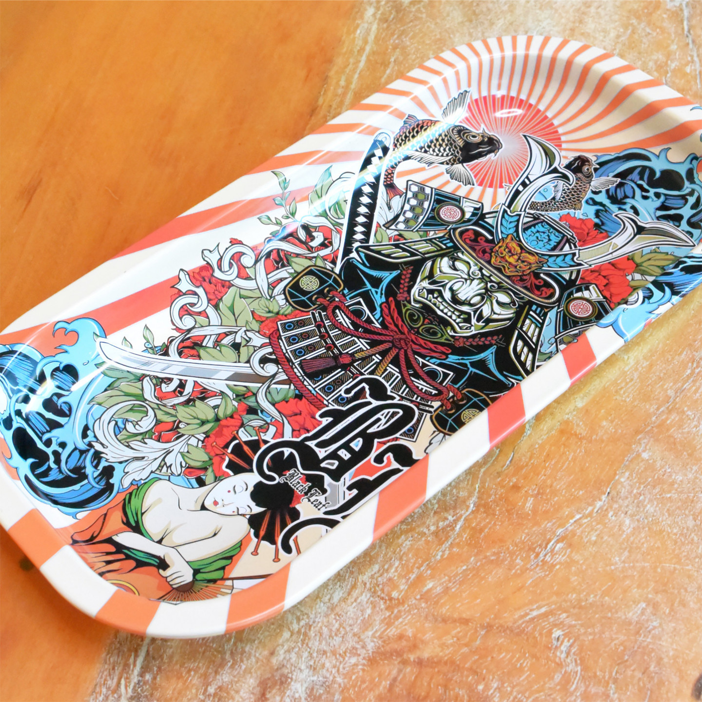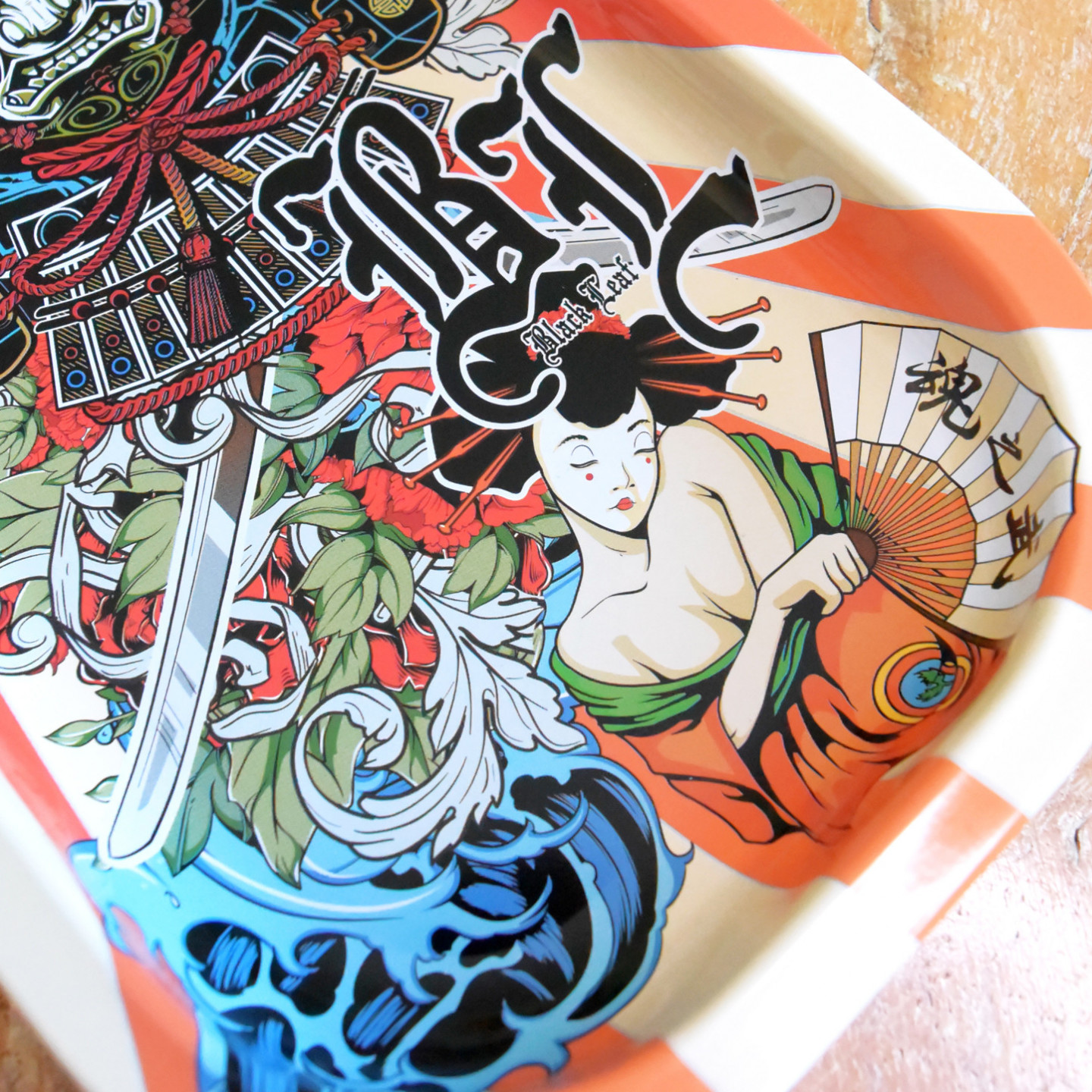 Plateau de roulage en métal au design Samouraï & Geisha, format compact 20 × 10 cm, signé Black Leaf.